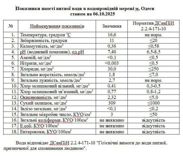 Кроме того, перед подачей в сеть вода проходит очистку и обеззараживание на европейском оборудовании. На всех этапах водоподготовки, по более чем 55 показателям, круглосуточно осуществляется лабораторный контроль. Кроме «Инфоксводоканала» параллельный лабораторный контроль осуществляет и Одесский областной центр контроля и профилактики заболеваний. По результатам последних исследований, водопроводная вода в Одессе соответствует всем санитарным требованиям к питьевой воде.