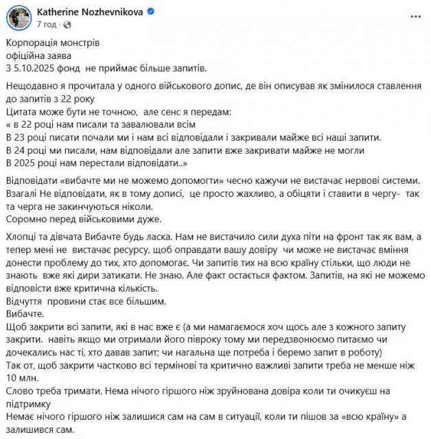 Кроме того, фонд не может найти себе помещение – после воздушного удара по Палацу Спорта, офису «монстров» пришлось искать новое место. Но все предприятия отказывают, а местные власти игнорируют проблему. После такого отношения к волонтерам, помогающим ВСУ с начала войны, становится понятным их пессимизм.