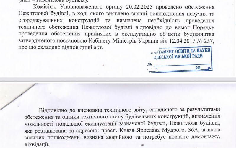 Директор департамента образования и науки Одесского городского совета Елена Буйневич сообщила, что панельное здание детского сада №283 начали сносить, потому что эксперты из комиссии признали его опасным. Но одесситов заверили, что на месте детского сада построят только новый детский сад. Землю под садик летом закрепили за садиком – это теперь земля образования.
