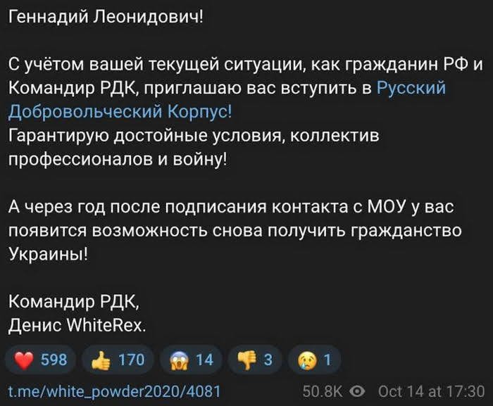 «Геннадий Леонидович! С учетом вашей текущей ситуации, как гражданин РФ и Командир РДК, приглашаю вас вступить в Русский Добровольческий Корпус! Гарантирую достойные условия, коллектив профессионалов и войну! А через год после подписания контракта с МОУ у вас появится возможность снова получить гражданство Украины!», – написал командир РДК. Но сегодня этот пост уже удалён. Пожалуй, предложение было с ограниченным временем – Труханов так и не воспользовался им. Теоретически, Труханов может воспользоваться этой нормой в законе, чтобы восстановить гражданство Украины.