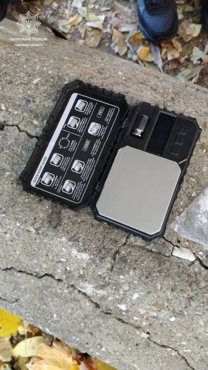 На днях в Одессе инспекторы патрульной полиции заметили мужчину на электросамокате, который, увидев патрульных, резко изменил направление движения. Во время поверхностной проверки у него обнаружили около ста свертков с кристаллическим веществом, вероятно, наркотическим, электронные весы и телефон с перепиской о сбыте наркотиков, сообщает пресс-служба патрульной полиции.
