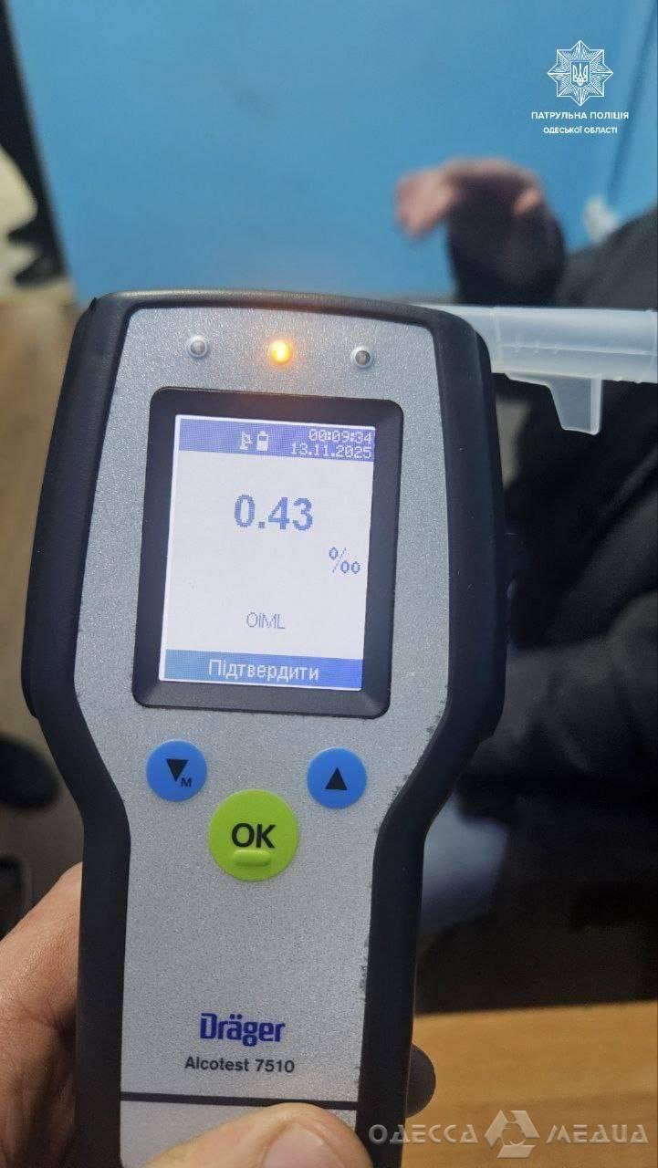 Після примусової зупинки електросамоката було встановлено, що водій має ознаки алкогольного сп'яніння. Результат огляду на приладі Drager показав 0,43 проміле.