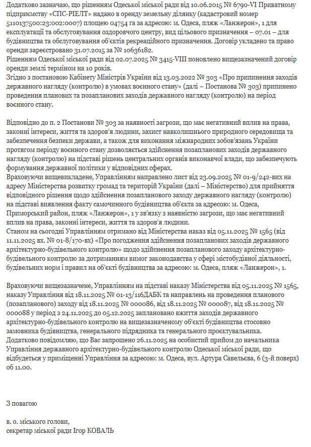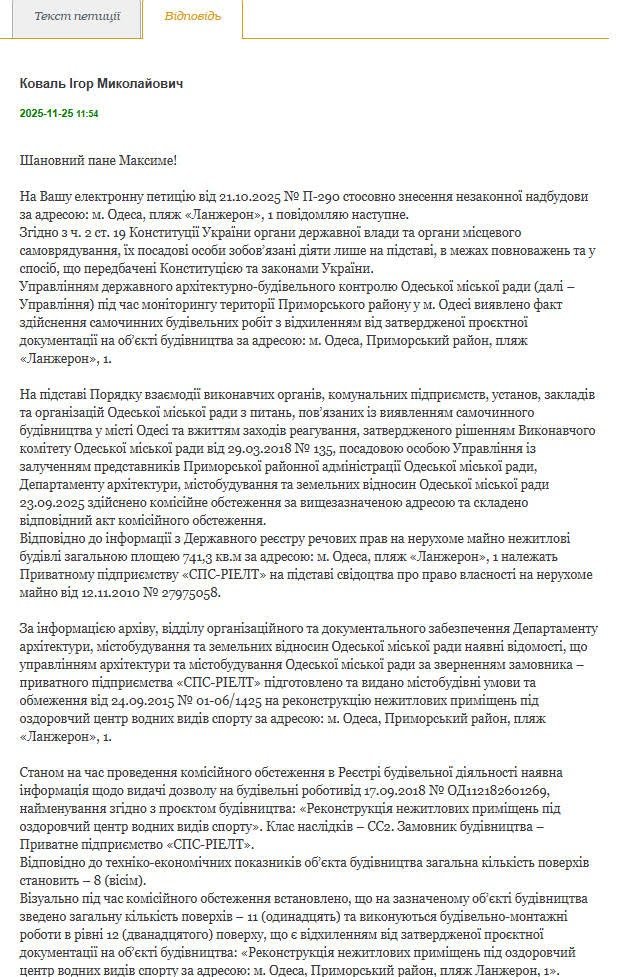 В Одесской мэрии отреагировали на петицию, которая получила необходимые 1000 голосов, о нарушении владельцами гостиницы на Ланжероне проектной документации — новостройка получила незаконных три этажа, перекрывающих историческую панораму моря из Мемориала Неизвестному матросу. И.о. Одесского городского головы Игорь Коваль сообщил в ответ, что во время мониторинга территории Приморского района выявлен факт осуществления самовольных строительных работ с отклонением от утвержденной проектной документации на объекте строительства по адресу: Одесса, Приморский район, пляж Ланжерон, 1.