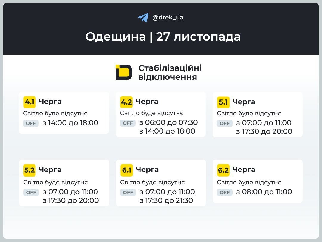 Графіки відключення світла в Одесі та на Одещині на 27 листопада опублікув ДТЕК.