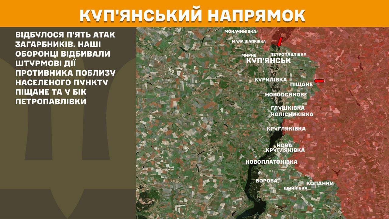 На Куп’янському напрямку вчора відбулося п’ять атак загарбників. Наші оборонці відбивали штурмові дії противника поблизу населеного пункту Піщане та у бік Петропавлівки.