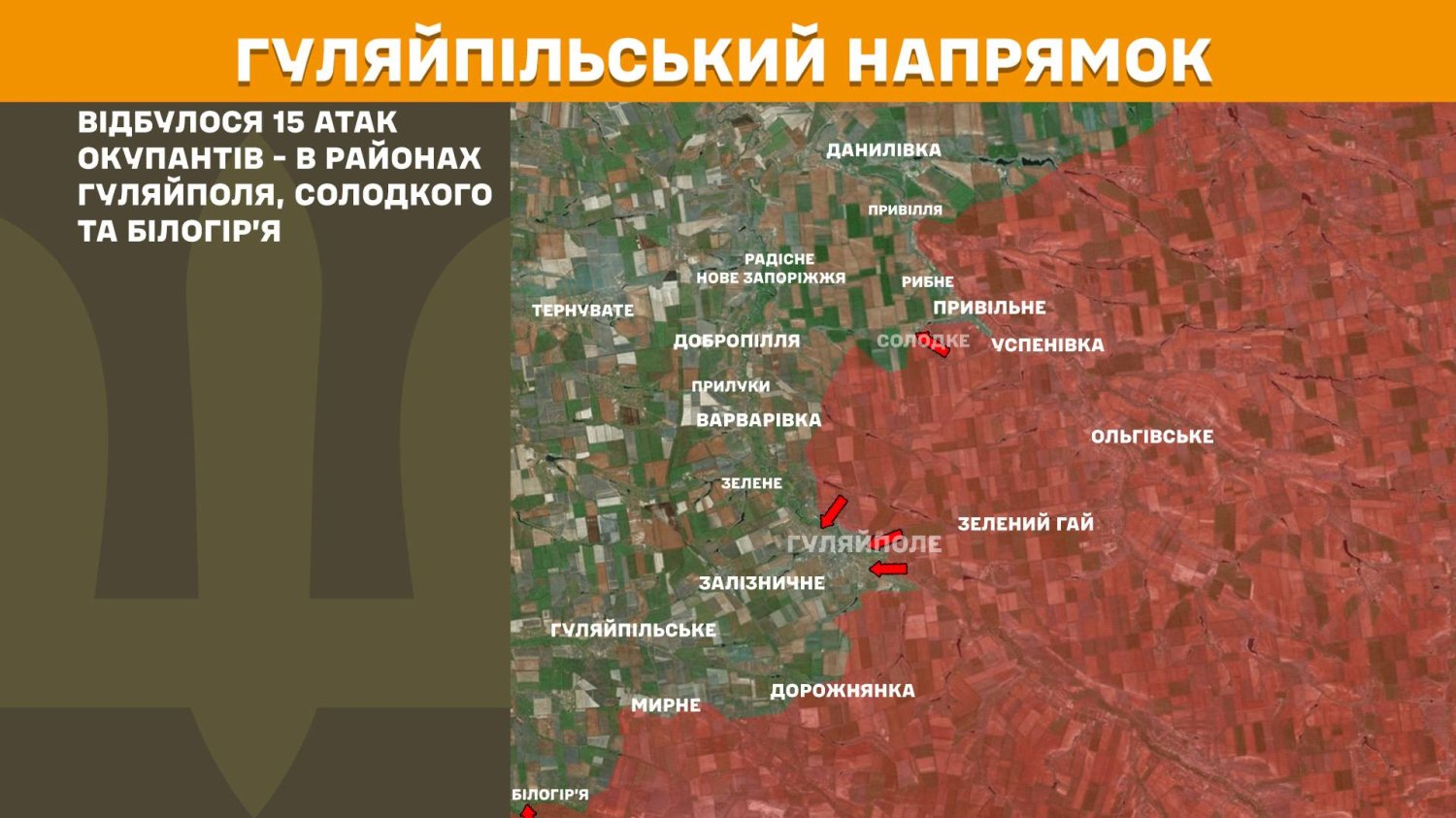 На Гуляйпільському напрямку відбулося 15 атак окупантів - в районах Гуляйполя, Солодкого та Білогір’я.