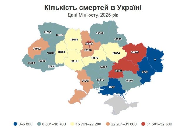 Понад 168,7 тисячі дітей народилося в Україні у 2025 році за даними Міністерства юстиції України. Водночас зафіксовано 485,2 тисячі смертей. Загалом на одного новонародженого минулого року припадало троє померлих.