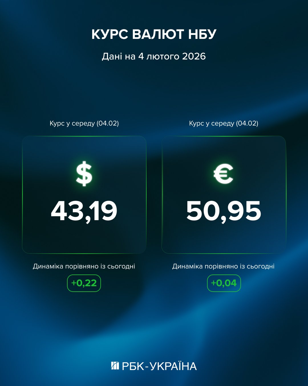Національний банк встановив курс долара на завтра, 4 лютого, на рівні 43,19 гривень (+22 копійки), курс євро - на рівні 50,95 гривні (+4 копійки).