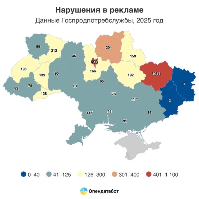 Лідером за кількістю порушень стали бізнеси на Харківщині: у 1248 досліджених рекламах знайшли 1014 порушень. Це найбільший показник по країни.