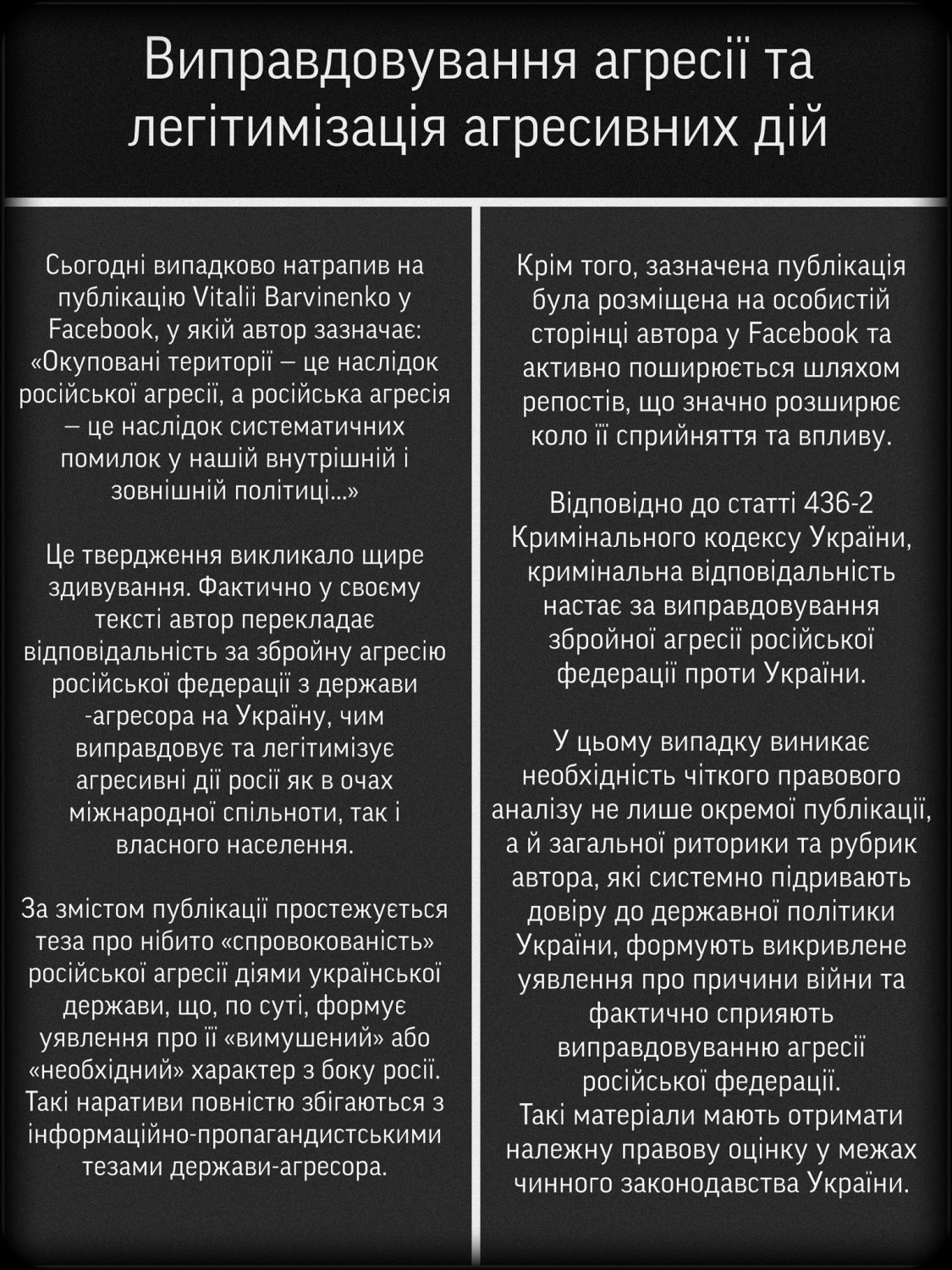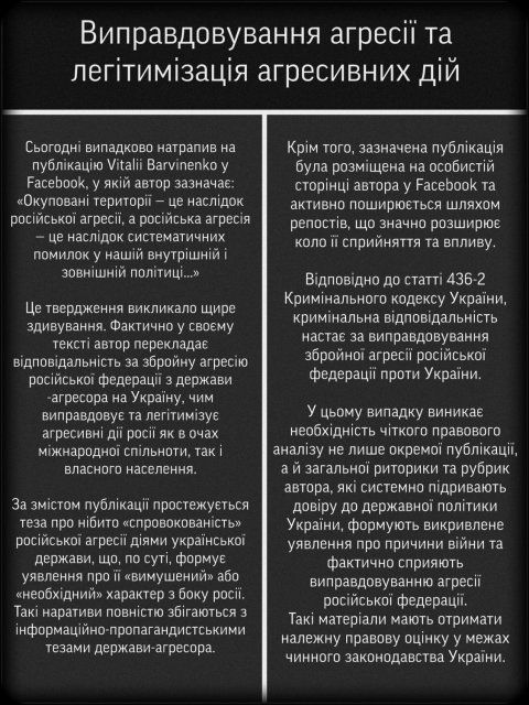 Крім того, зазначена публікація була розміщена на особистій сторінці автора у Facebook та активно поширюється шляхом репостів, що значно розширює коло її сприйняття та впливу. Відповідно до статті 436-2 Кримінального кодексу України, кримінальна відповідальність настає за виправдовування збройної агресії Російської Федерації проти України», - відзначив Вербицький.