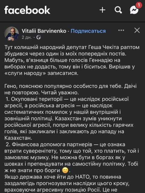 За його словами, у цьому випадку виникає необхідність чіткого правового аналізу не лише окремої публікації, а й загальної риторики та рубрик автора, які системно підривають довіру до державної політики України, формують викривлене уявлення про причини війни та фактично сприяють виправдовуванню агресії Російської Федерації.