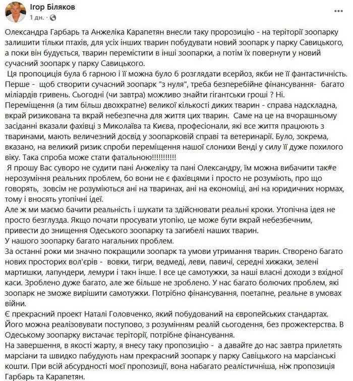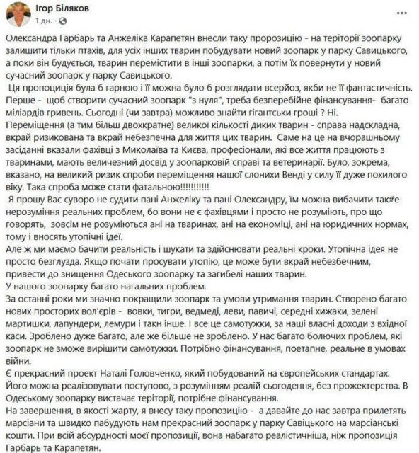 Депутатки Одесской мэрии Александра Гарбарь и Анжелика Карапетян предложили перенести Одесский зоопарк в парк Савицкого из-за небольших вольеров крупных животных и устаревшие стандарты обитания животных, которые остались неизменными еще со времен СССР. Об этом сообщил директор зоопарка Игорь Беляков и в свою очередь раскритиковал эту идею — сам факт увеличения площади зоопарка звучит очень привлекательно и парк Савицкого в принципе для этого подходит, но построить новый зоопарк во время войны нереально, потому что проект нуждается в огромном бюджете, который сейчас никто не даст, или дадут часть, а потом проект заморозят. К тому же перемещение некоторых крупных животных рискованно – слониха Венди уже стара и может не перенести переезд на новое место.