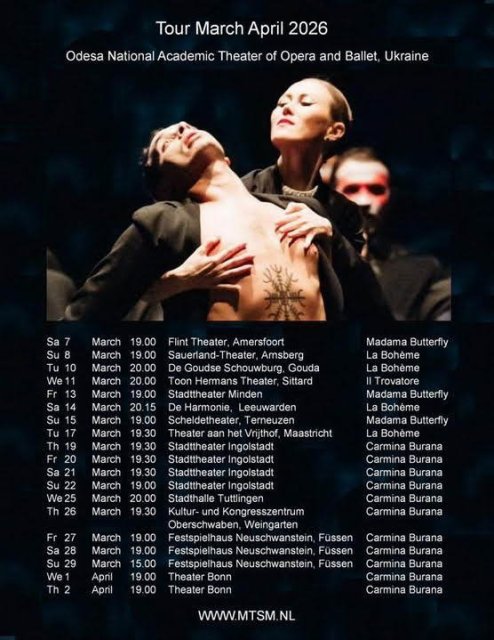 Коллектив Одесской национальной оперы отправился в длительный гастрольный тур по Королевству Нидерланды и Германии. Европейской публике уже были представлены оперы «Богема» и «Мадам Баттерфляй» Дж. Пуччини, а также «Трубадур» Дж. Верди, которые показываются с полными зрительными залами.