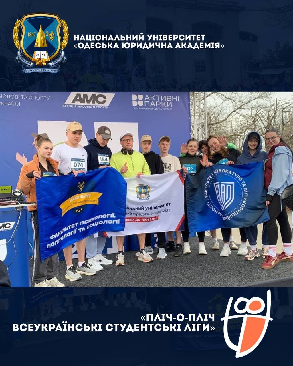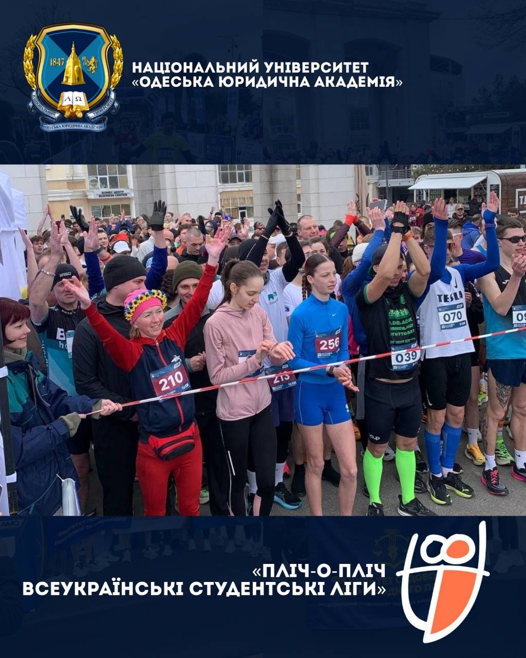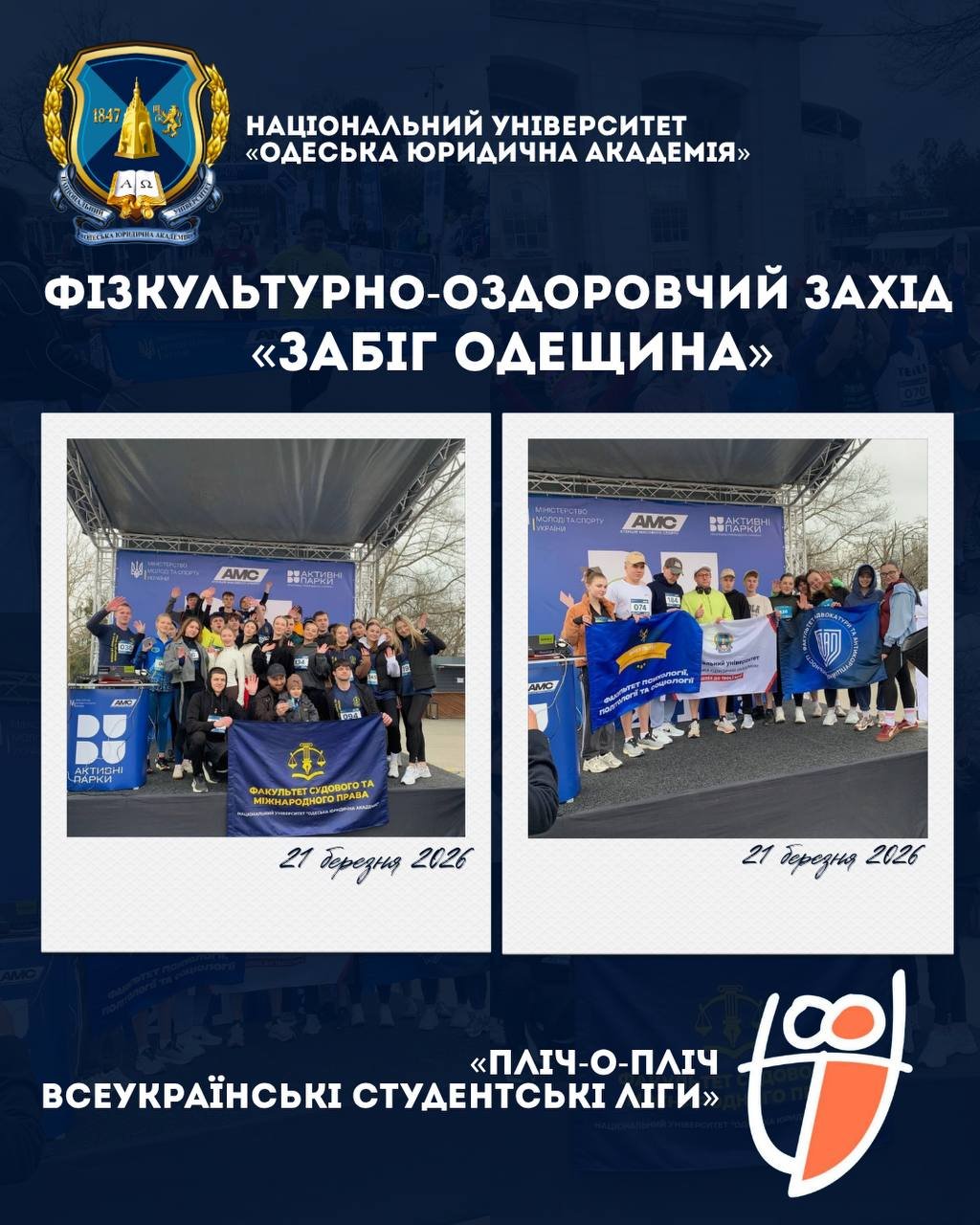 21 березня колектив Національного університету «Одеська юридична академія» взяв участь у фізкультурно-оздоровчому заході «Забіг Одещина», який передував старту Першого сезону Всеукраїнського турніру «Пліч-о-пліч всеукраїнські студентські ліги».