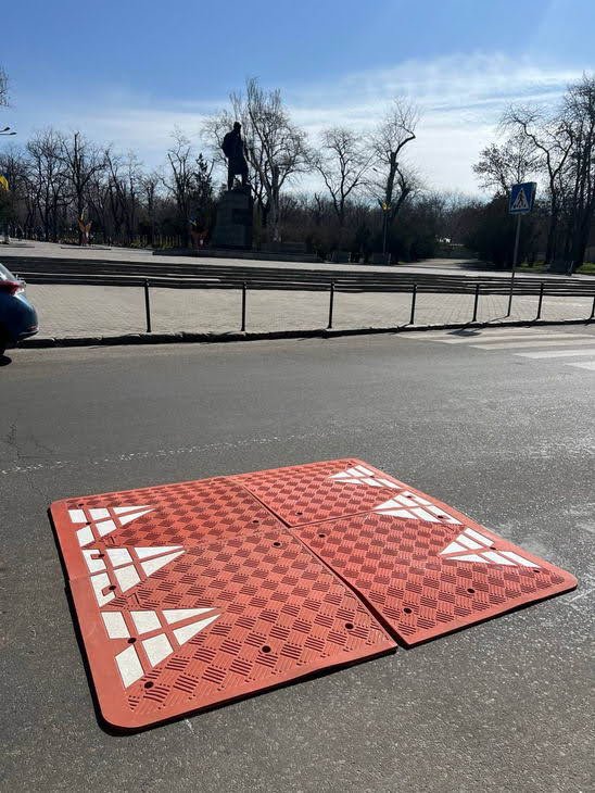 В Одессе на пересечении улиц Маразлиевской и Сабанского переулка установлены резиновые дорожные элементы принудительного снижения скорости — так называемые «берлинские подушки», которые в двух направлениях движения придают безопасности перед пешеходными переходами.