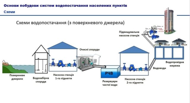 До зупинки роботи водопостачання призводять і удари по енергетичній системі. Електрика потрібна для роботи насосів, які забезпечують рух води. Саме вони підіймають воду з річок або свердловин, подають її на очищення і створюють тиск у трубах, щоб вода доходила до будинків, особливо на верхні поверхи.