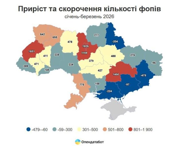 На 11 297 нових ФОПів більше відкрилось, ніж закрилось за перший квартал 2026 року. Загалом 63 920 підприємців відкрили свою справу, а 52 623 фопи припинили свою діяльність з січня по березень цьогоріч.