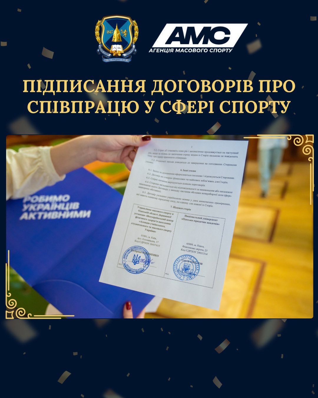 За результатами обговорень НУ «ОЮА» в особі президента Університету, академіка Сергія Ківалова було укладено одразу два договори про співробітництво: із керівництвом Агенції масового спорту Одеської області Катериною Юхименко та Зоєю Дмитрук; а також – із головою Федерації хокею на траві в Одеській області Сергієм Донцовим.