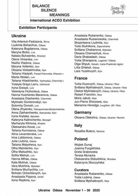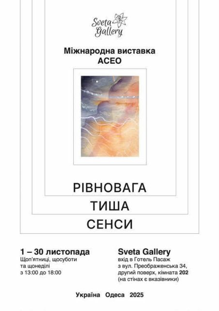 В Одессе в галерее Sveta Gallery в Пассаже открылась выставка миниатюрных картин «РАВНОвесИЕ, ТИШИНА, СМЫСЛИ», выполненных в формате АСЕО — они имеют стандартный размер 2.5 x 3.5 дюйма. Всего на выставке представлено 400 миниатюрных картин из 65 художников из Украины, Польши, Франции, Германии и Италии.