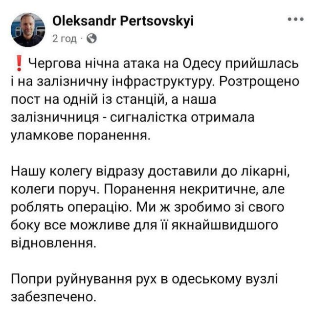 Россия продолжает террористические атаки по мирным жителям Одессы. С вечера 18 декабря до утра 19 декабря было несколько волн атак ударными дронами-камикадзе по Одессе. Так рашисты повредили подстанцию в Пересыпском районе Одессы, что привело к очередным аварийным отключениям света, воды и тепла. Два дрона-камикадзе типа «гербера» попали в многоэтажки в Киевском районе Одессы, в квартирах выбиты окна. Под утро враг нанес удары по железнодорожному посту в пределах Одессы и уничтожил его. Ранение получила железнодорожница-сигналистка, сообщил Александр Перцовский, председатель правления Укрзализныци. Ее госпитализировали и делают операцию.