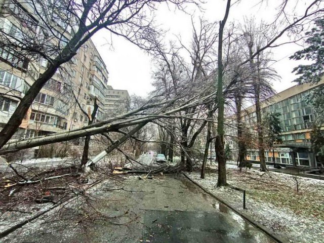 В Одессе сегодня 26 января продолжается ненастье: в результате дождя со снегом и резкого снижения температуры ниже нуля градусов все в городе покрылось слоем льда. Порывистый ветер и дополнительный вес на ветках деревьев привели к их падению.