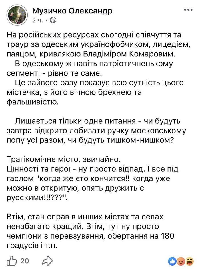 В Одесском университете имени Мечникова сообщили, что инициировали служебное расследование преподавателя Александра Музычко, профессора кафедры археологии, этнологии и всемирной истории. В университет обратились многие одесситы, которых возмутила публикация в Фейсбуке Музыка о смерти известного актера и музыканта Владимира Комарова, которая носит оскорбительный характер, имеет необоснованные обвинения и разжигает вражду.