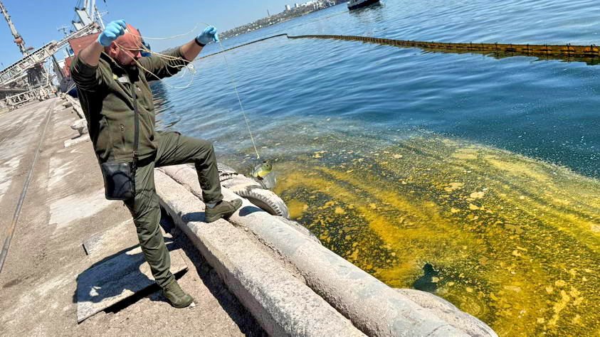 Сообщается, что продолжаются меры по локализации разлива с помощью барьеров на поверхности воды. Загрязнение грунтов не зафиксировано, поскольку участок имеет бетонное покрытие. Инспекция взяла пробы морской воды для лабораторных исследований. Экологи начинают подсчитывать вред морской среде, причиненный в результате российской вооруженной агрессии.